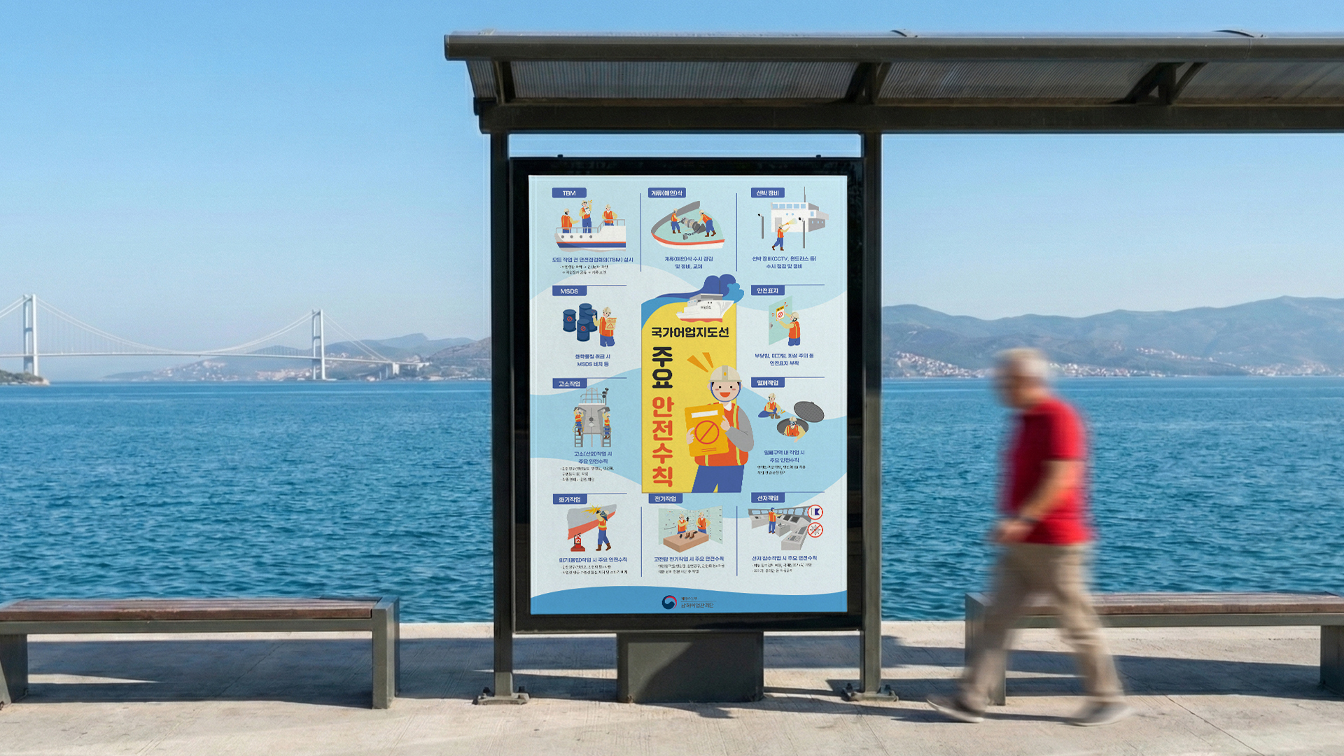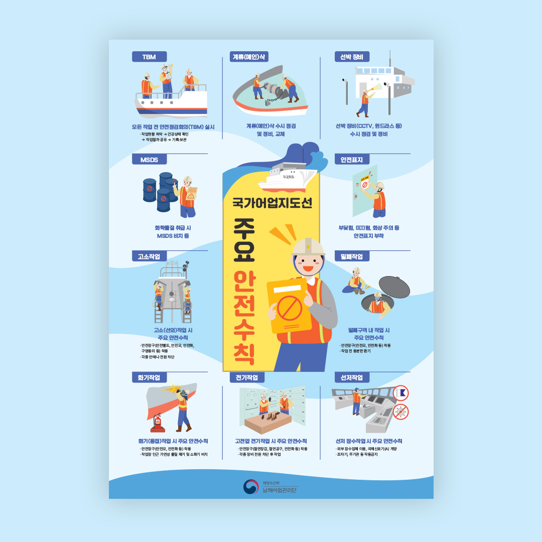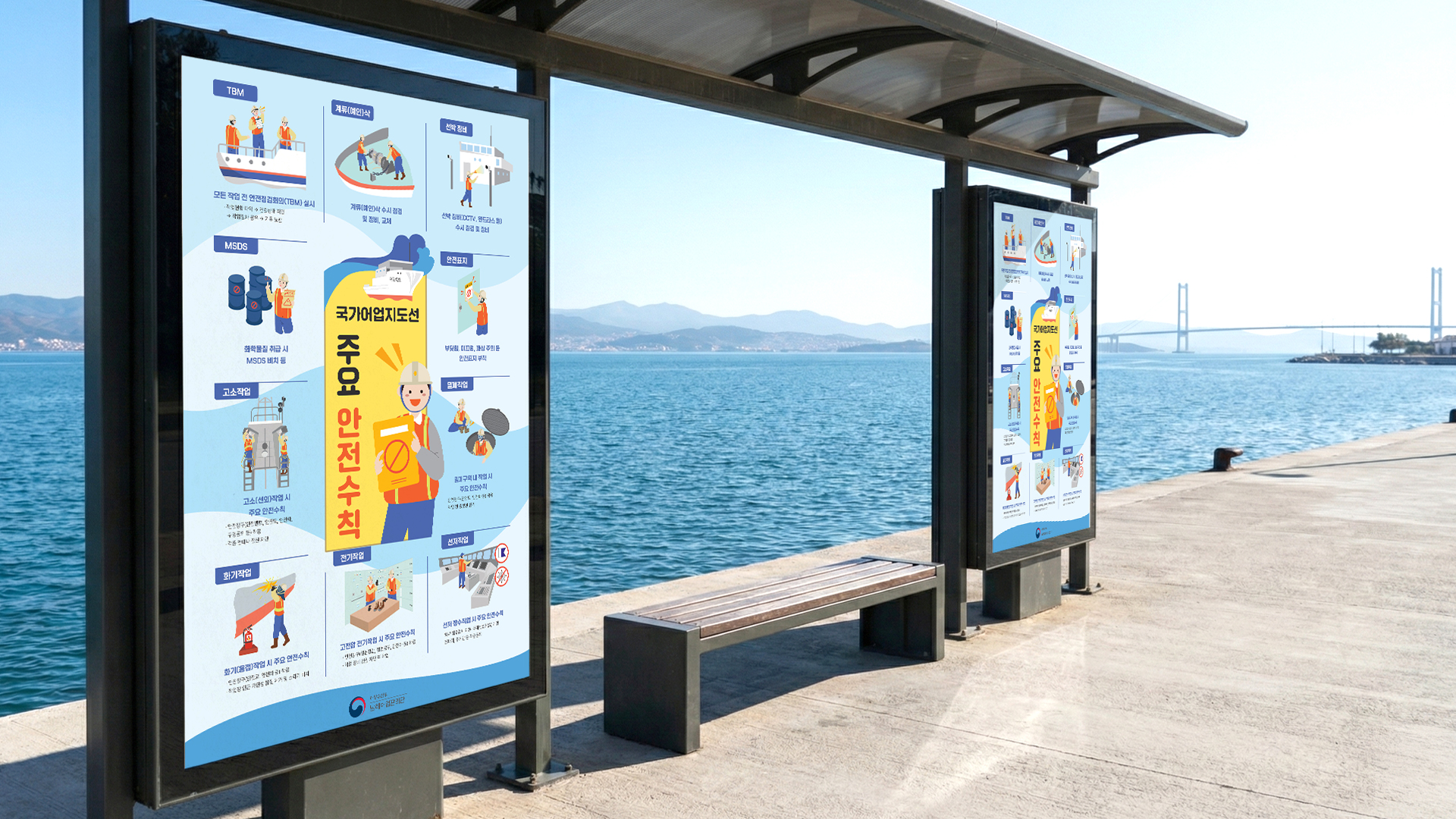 중앙 타이틀에 먼저 시선이 닿고, 자연스럽게 주변 정보를 따라 읽게 되는 창의적인 레이아웃으로, 만족도가 높았던 포스터 입니다. 클라이언트 요청에 따라 직관적인 일러스트를 제작하여 안전 수칙 포스터를 완성하였습니다.
